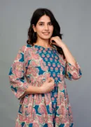 Step into elegance with this teal blue printed dress and shrug set, designed for effortless grace and comfort.