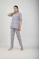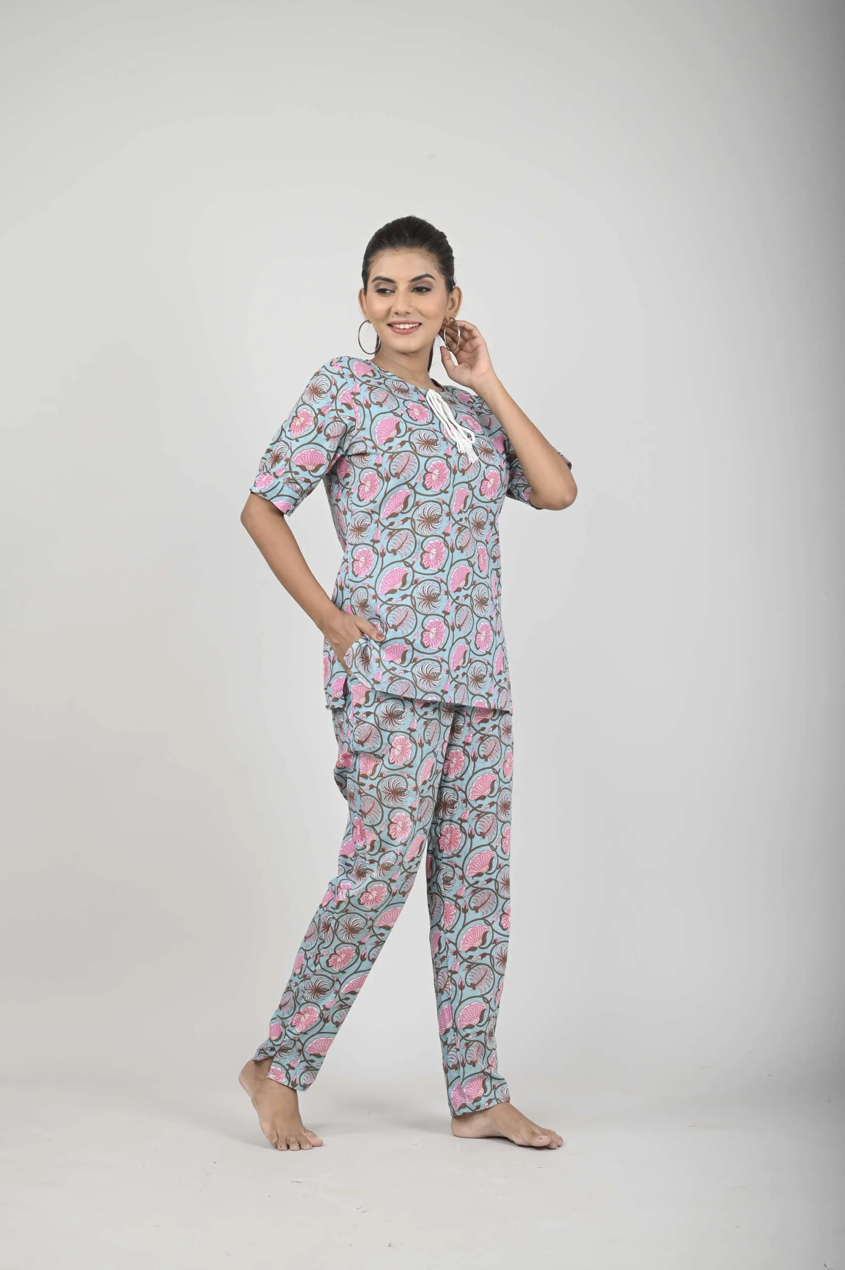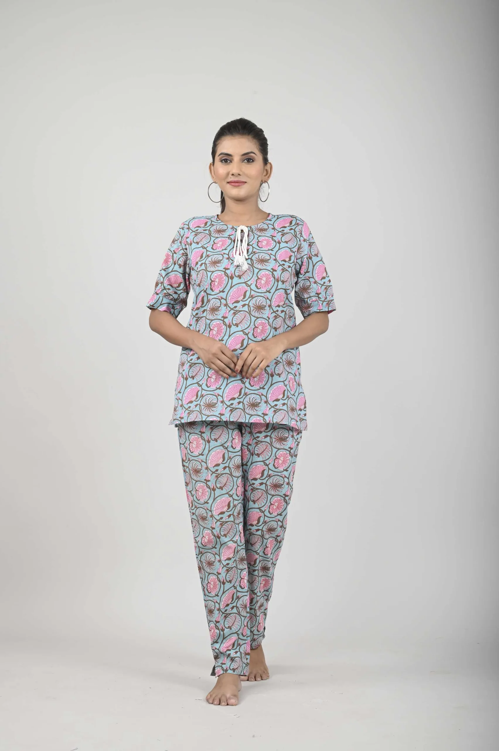 What Can Be More Flattering a Loungewear / Night Wear That Is Comfortable to Slip in And Also Very Stylish to Look At, With sky blue Floral Printed Nightwear You Just Have Your Basics Right! So,