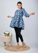 This blue floral peplum top is crafted in cotton.it feature a wide V neck neckline, three fourth Puff sleeves, Front Button detail on placket