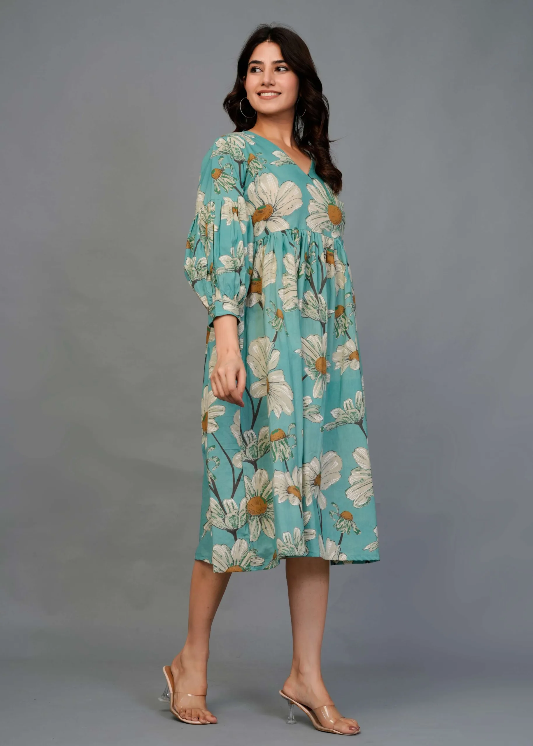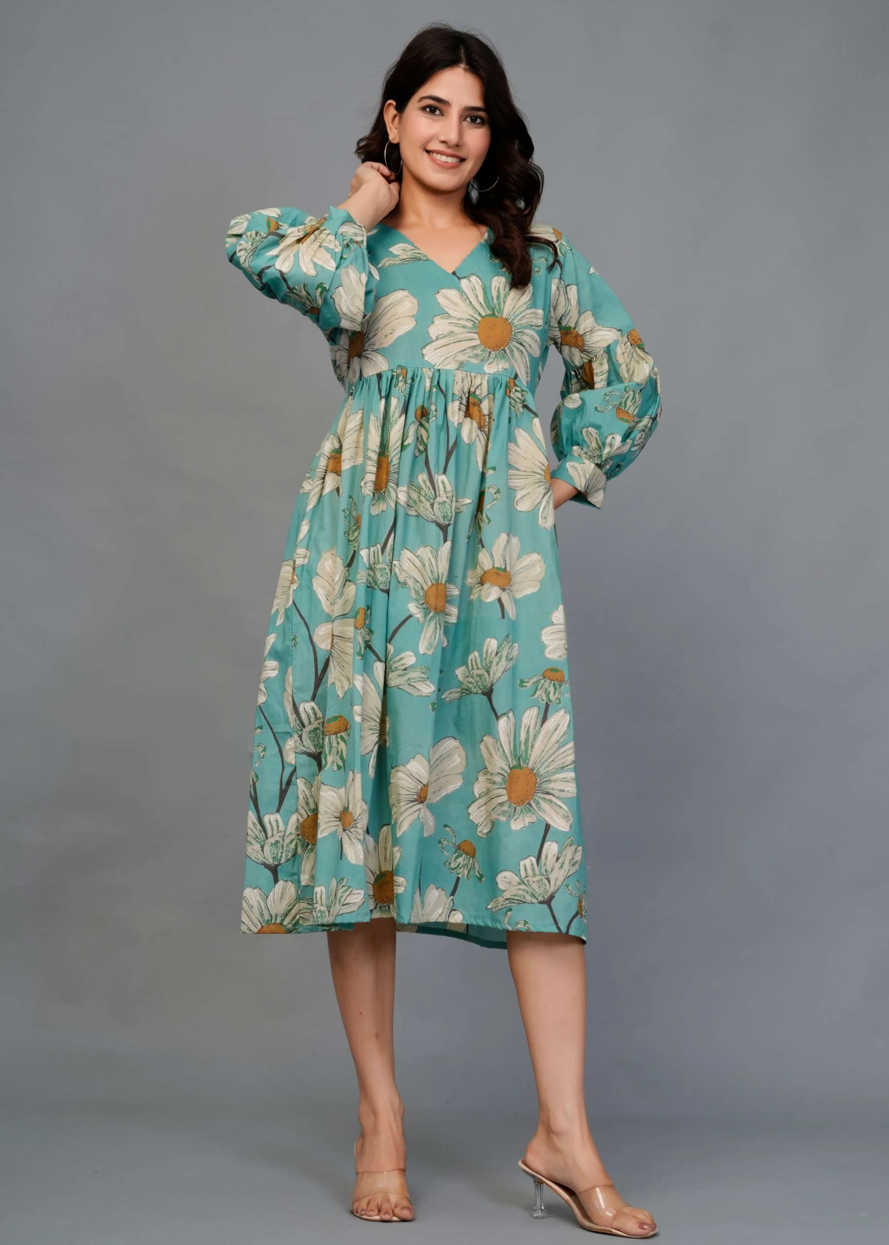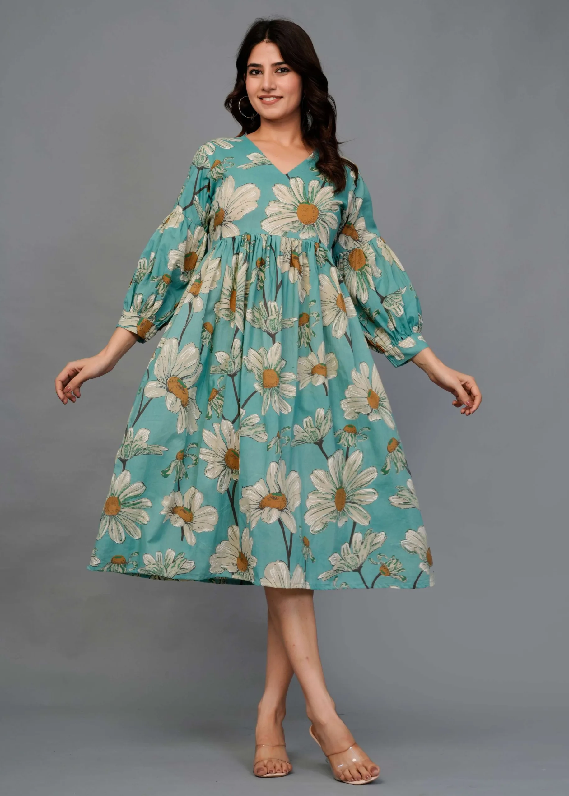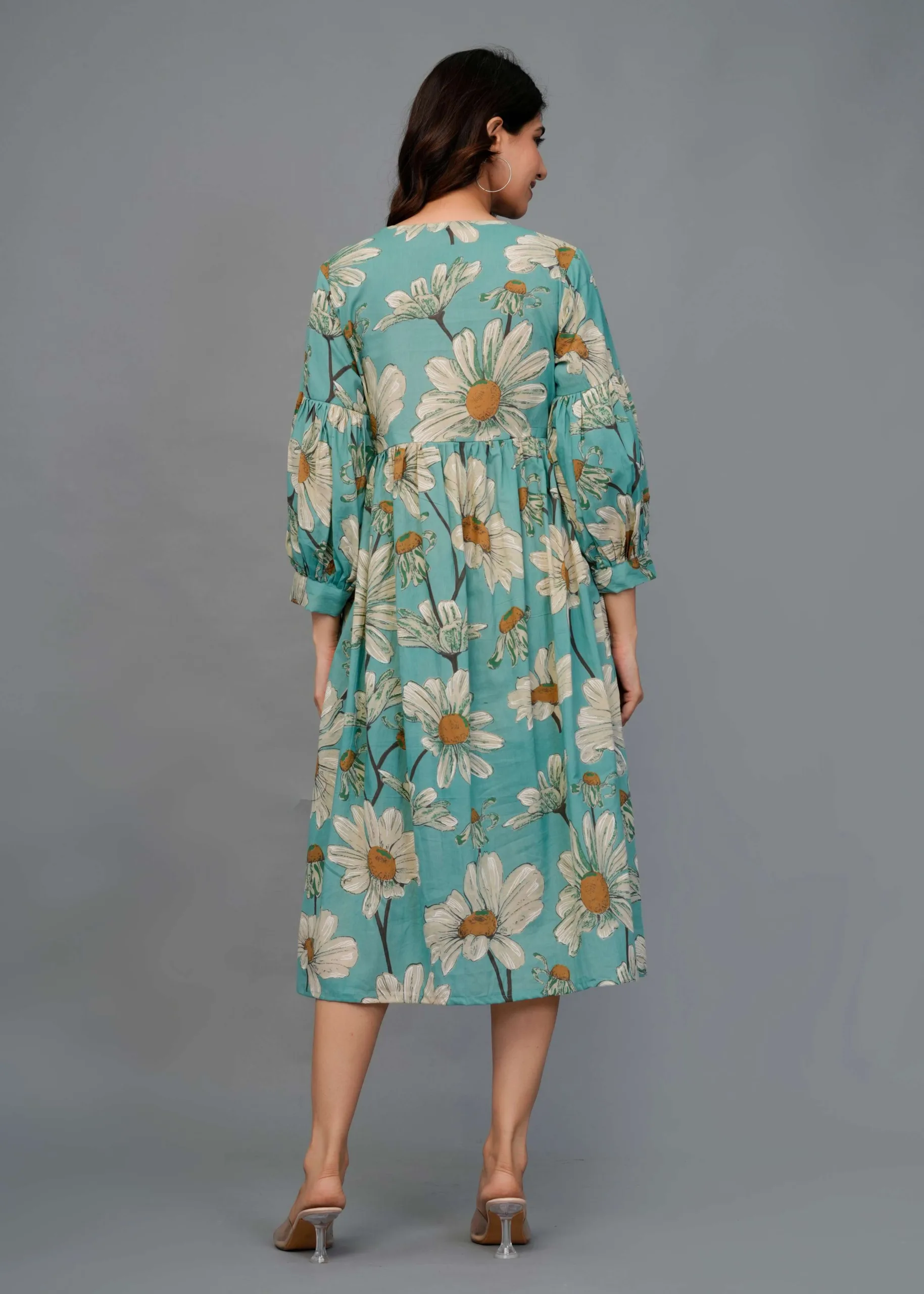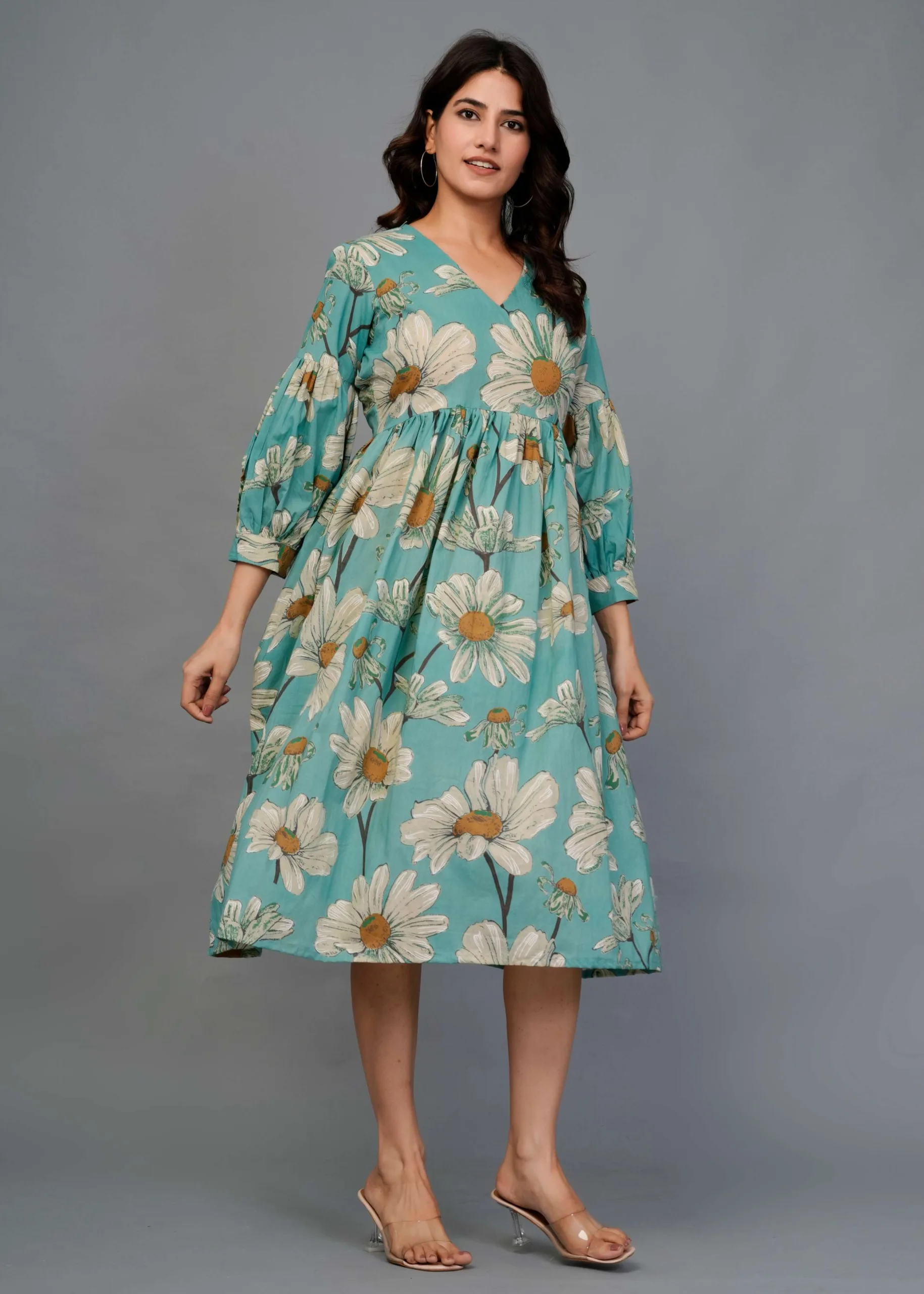 This beautiful teal floral midi dress exudes effortless charm and comfort. Crafted from lightweight, breathable cotton, the dress features a vibrant oversized daisy print in shades of white and mustard that pop against the serene teal base. The design is enhanced with a V-neckline and puffed full sleeves with gentle gathers at the cuffs, adding a touch of vintage elegance.