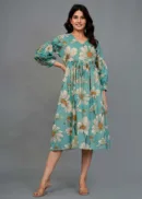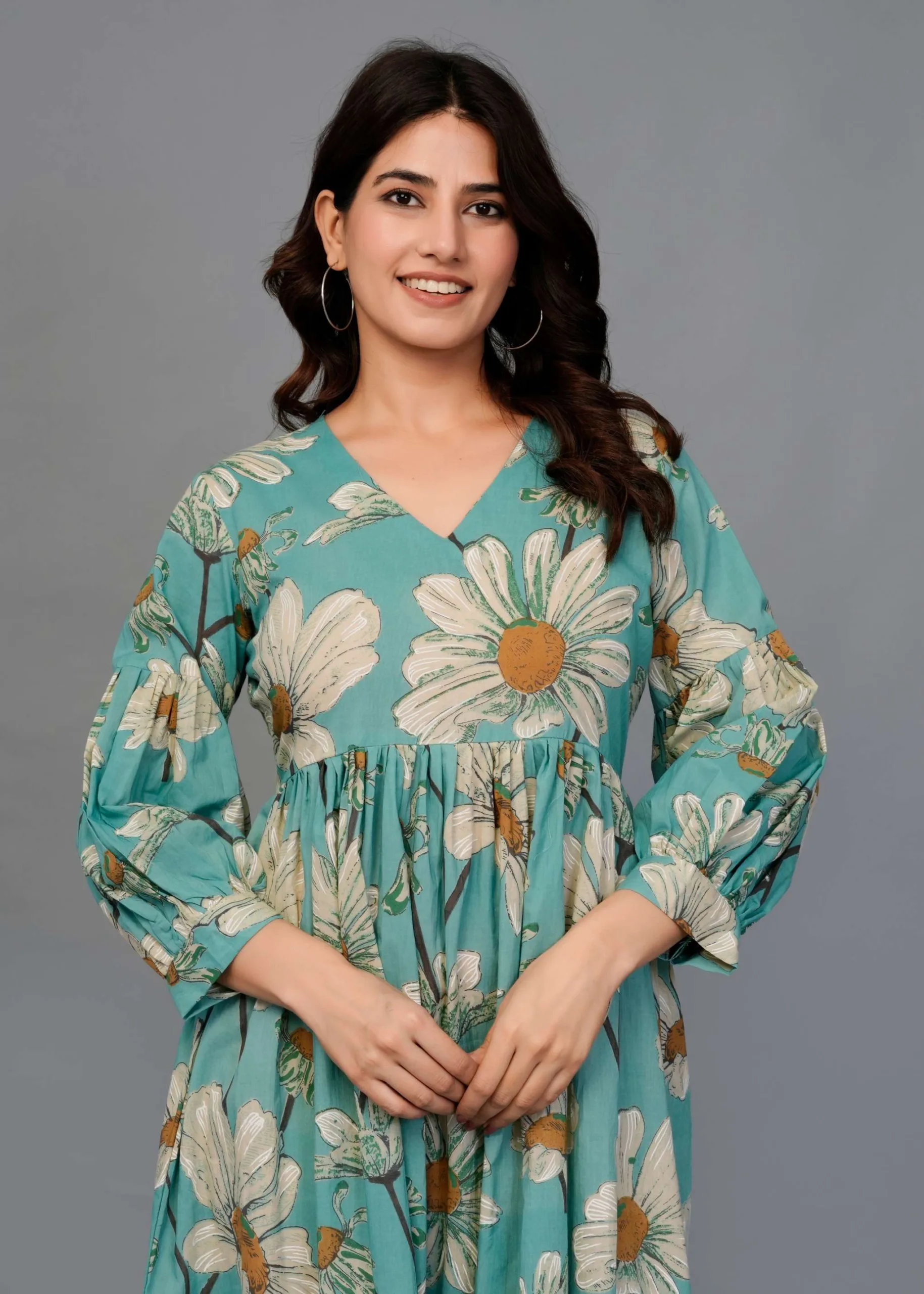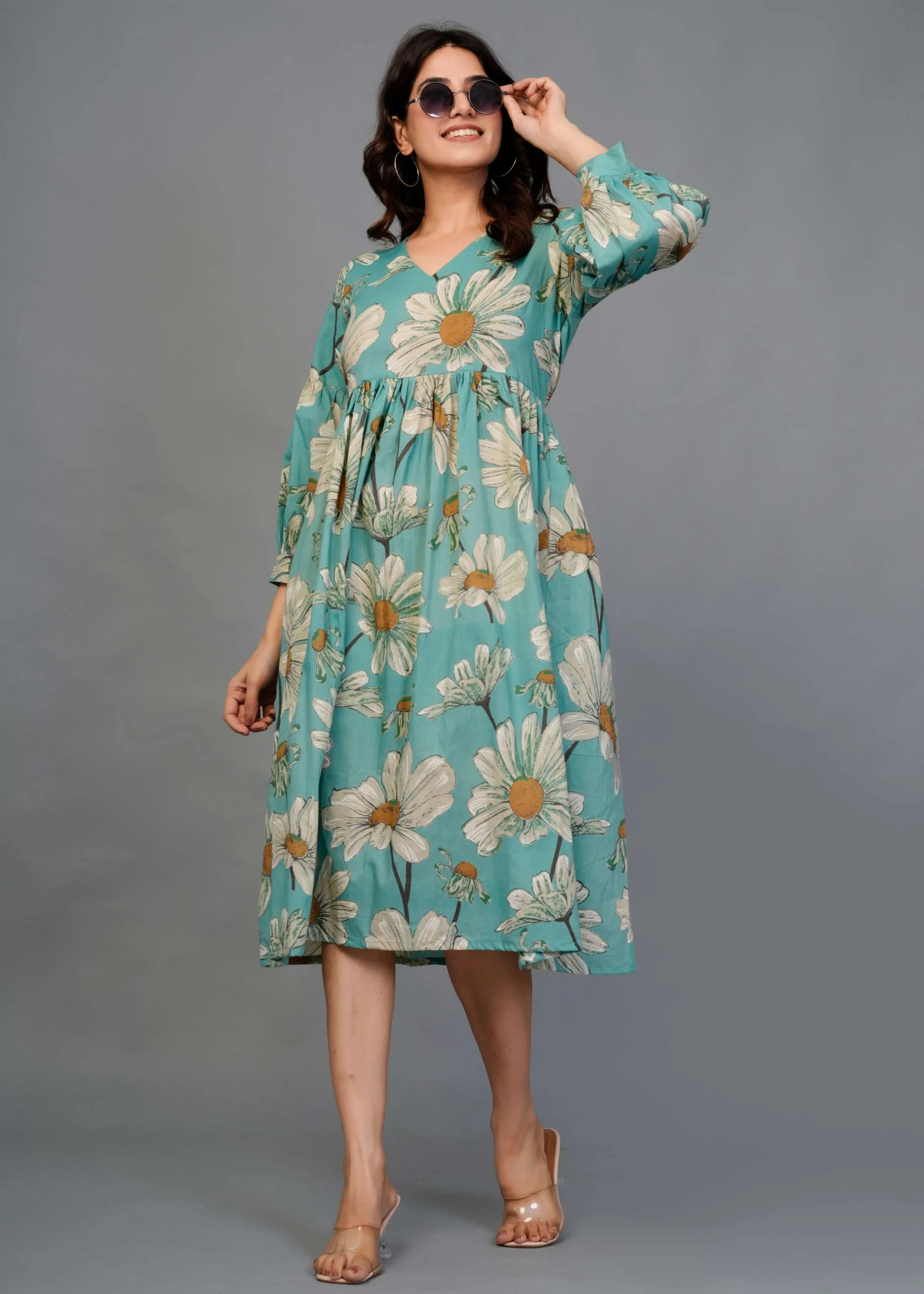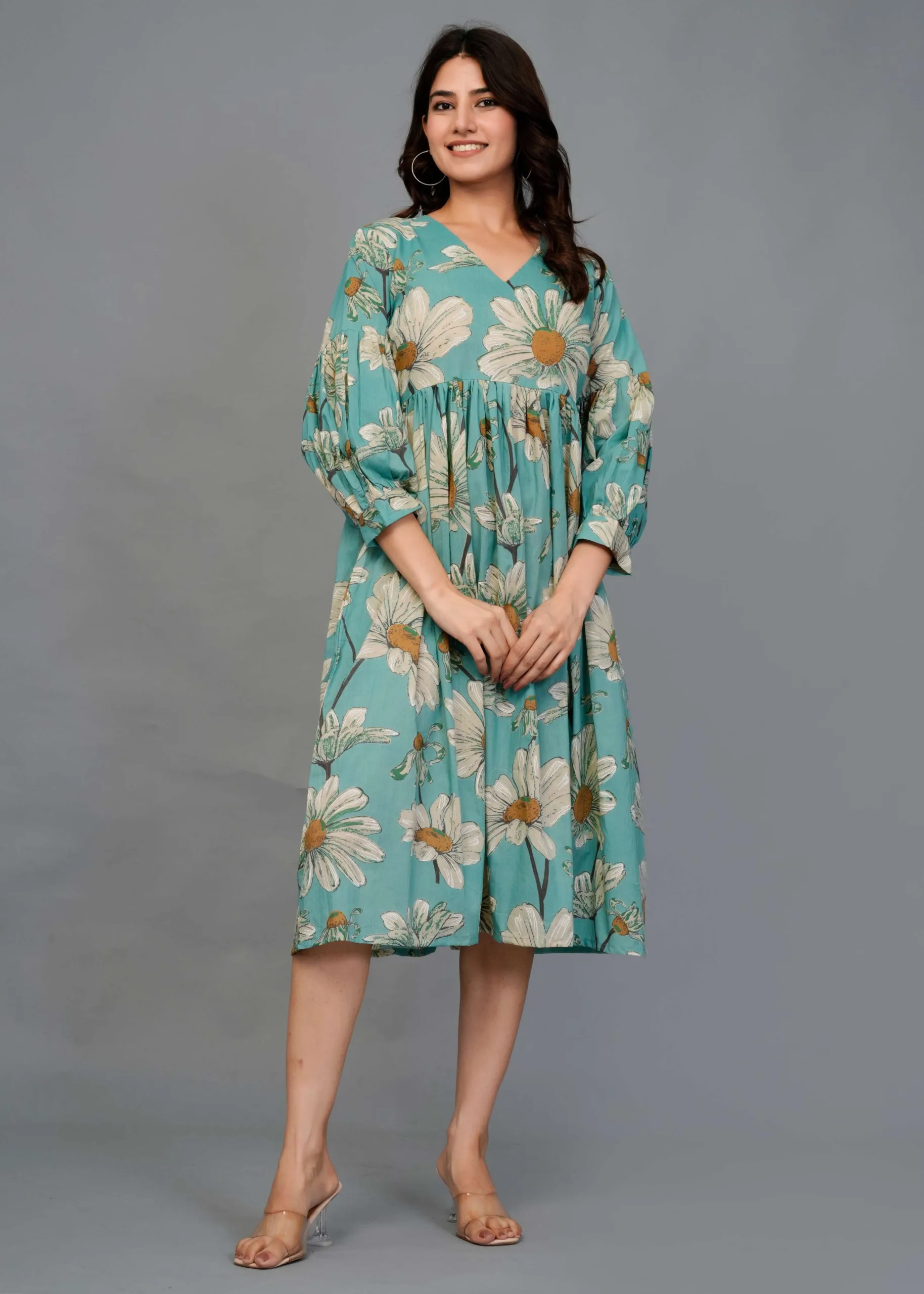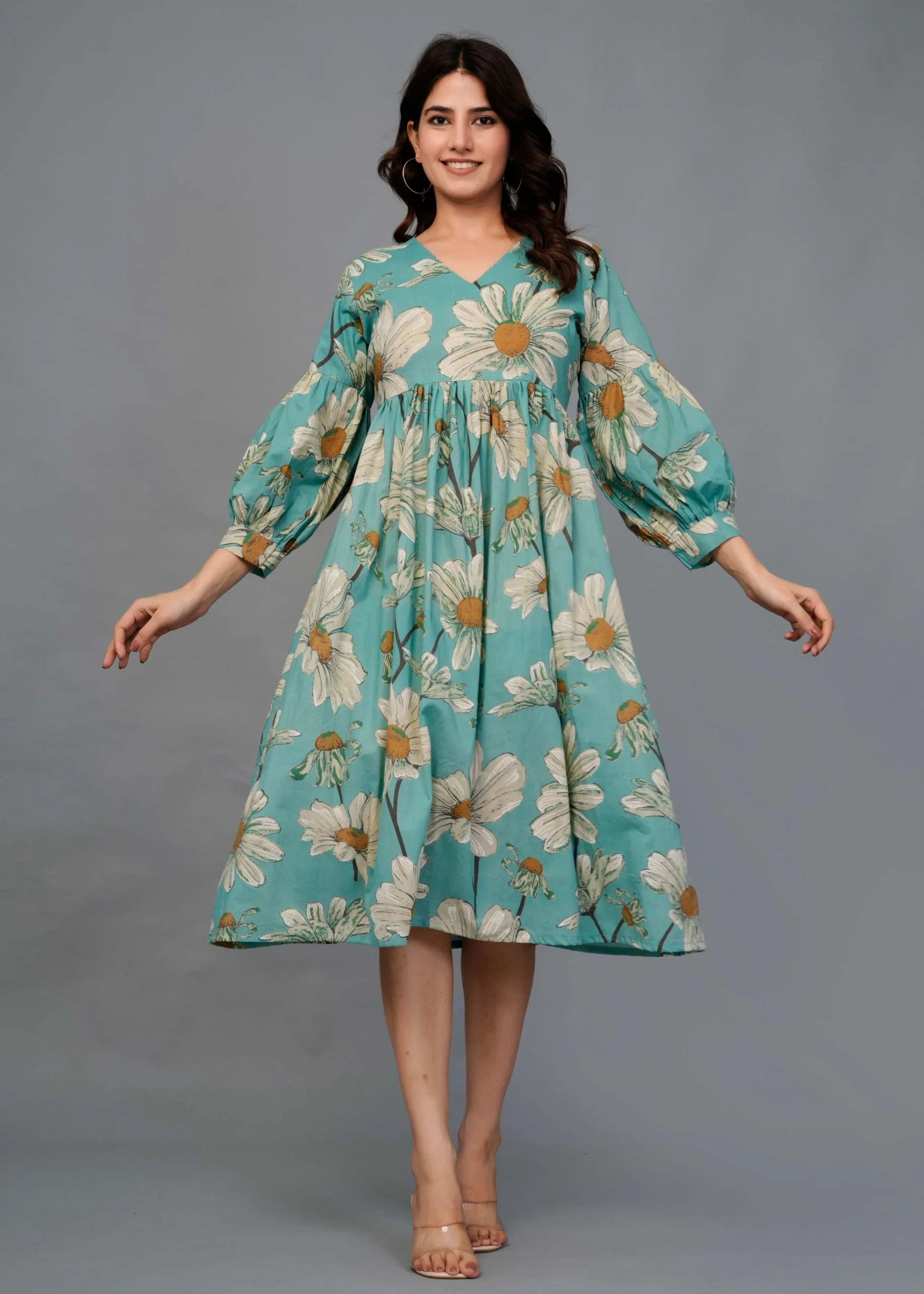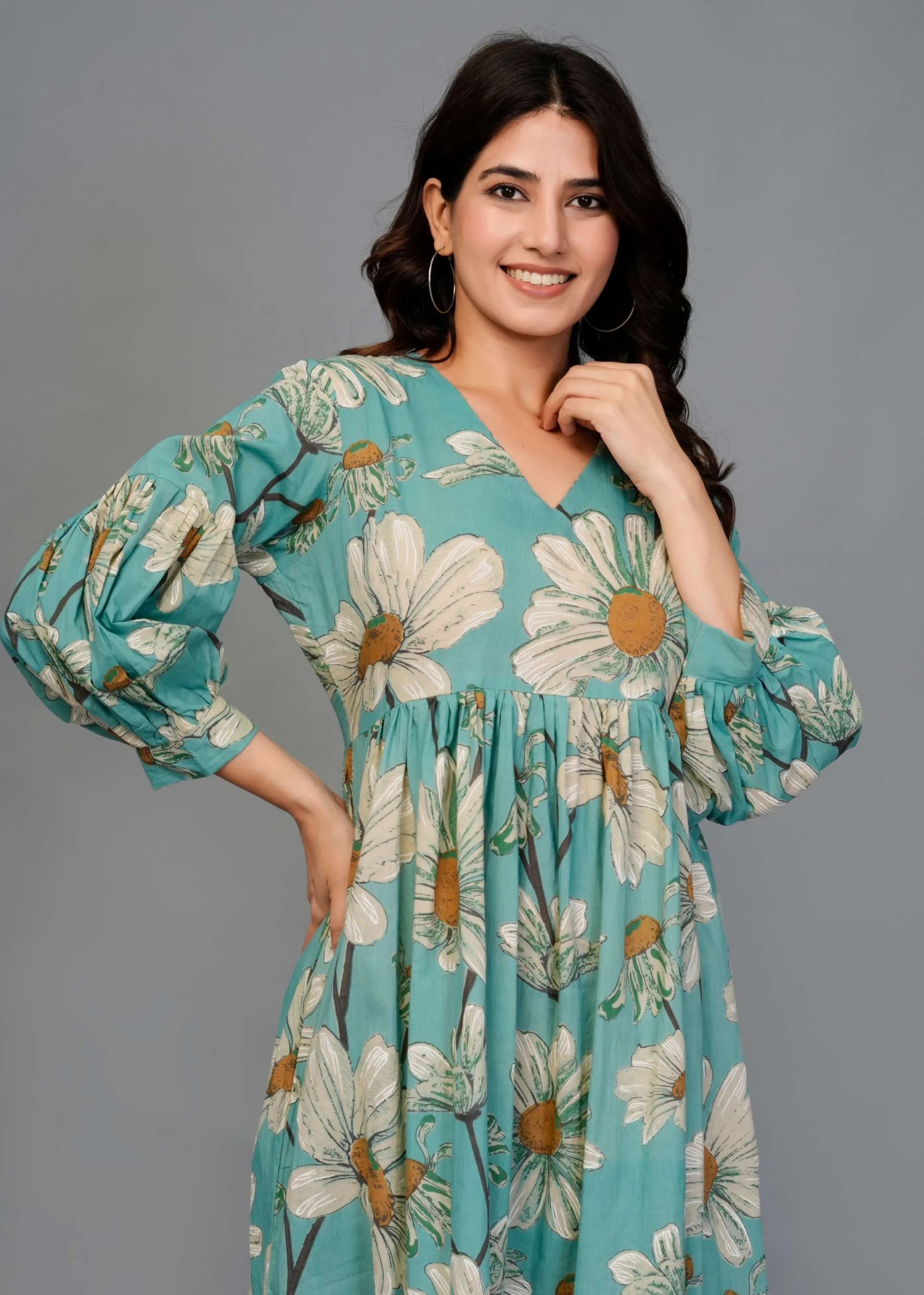 This beautiful teal floral midi dress exudes effortless charm and comfort. Crafted from lightweight, breathable cotton, the dress features a vibrant oversized daisy print in shades of white and mustard that pop against the serene teal base. The design is enhanced with a V-neckline and puffed full sleeves with gentle gathers at the cuffs, adding a touch of vintage elegance.