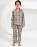 Make bedtime fun and cozy with this print features hand-drawn, swirled floral motifs resembling abstract roses in earthy brown on a white base. The playful spirals give it a natural yet artistic charm, making it look both lively and soothing — perfect for a cozy night suit with a touch of elegance.