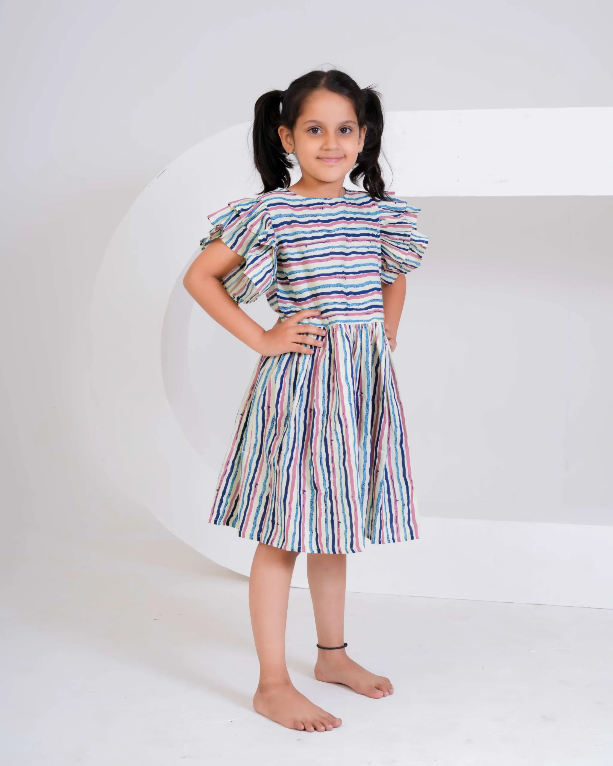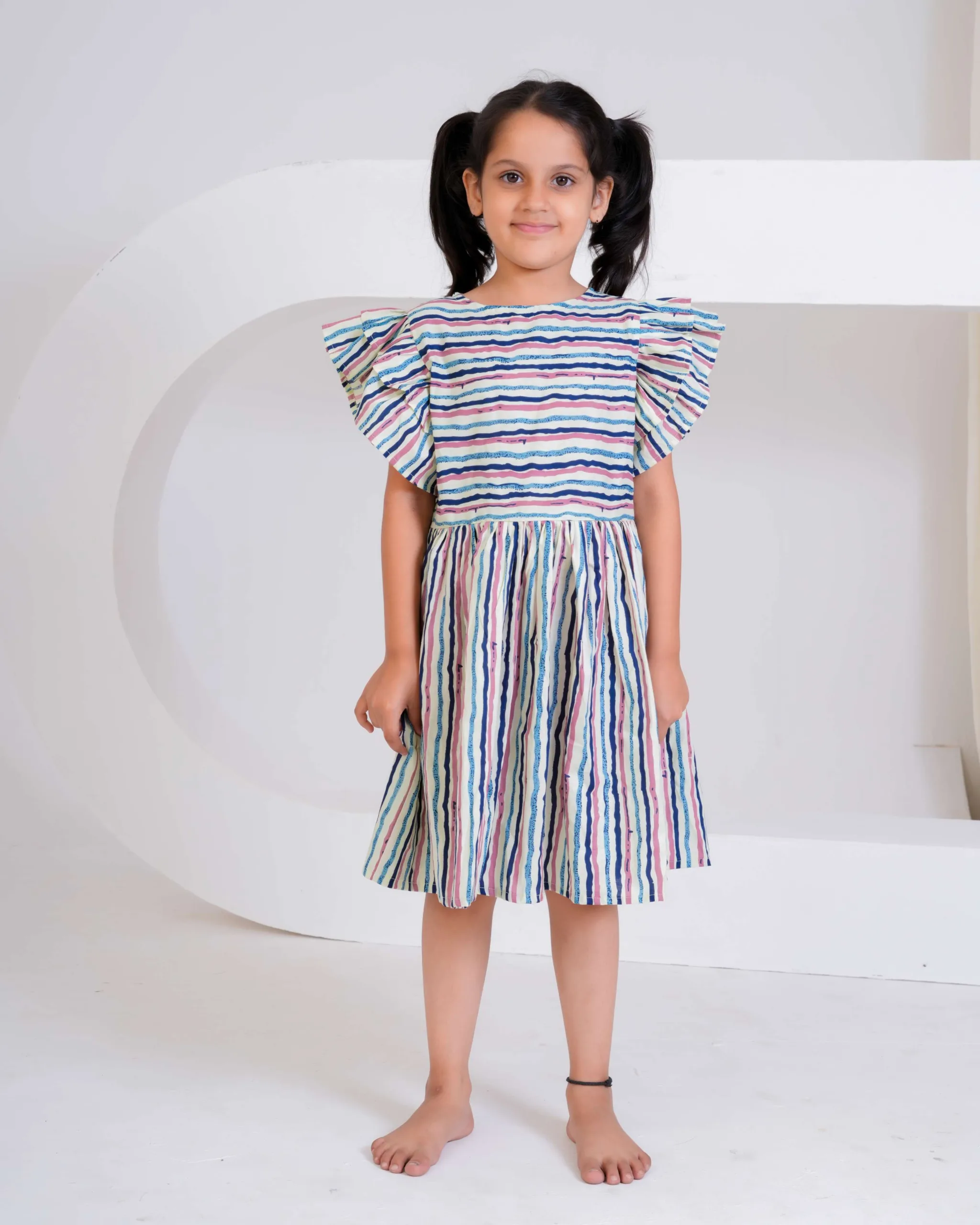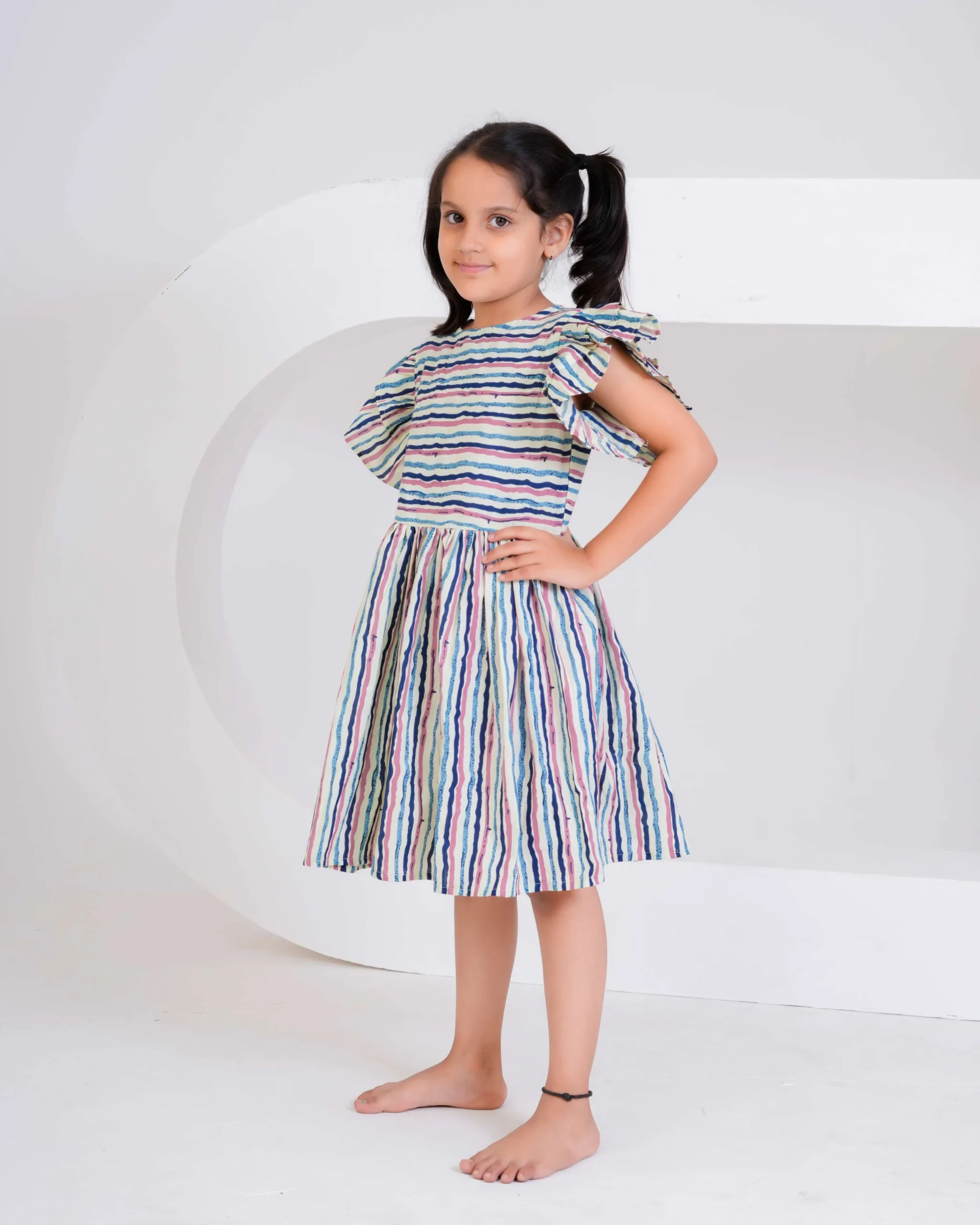 Brighten up your little one’s day with this multi-colored striped cotton dress — a perfect blend of comfort and cheerful style! The dress features playful flutter sleeves and a gathered flared skirt, making it ideal for twirling and all-day fun. Crafted from soft, breathable cotton, it ensures comfort in every season. The vibrant hand-painted–style stripes add a modern yet playful charm, making it perfect for casual outings, picnics, or everyday adventures.