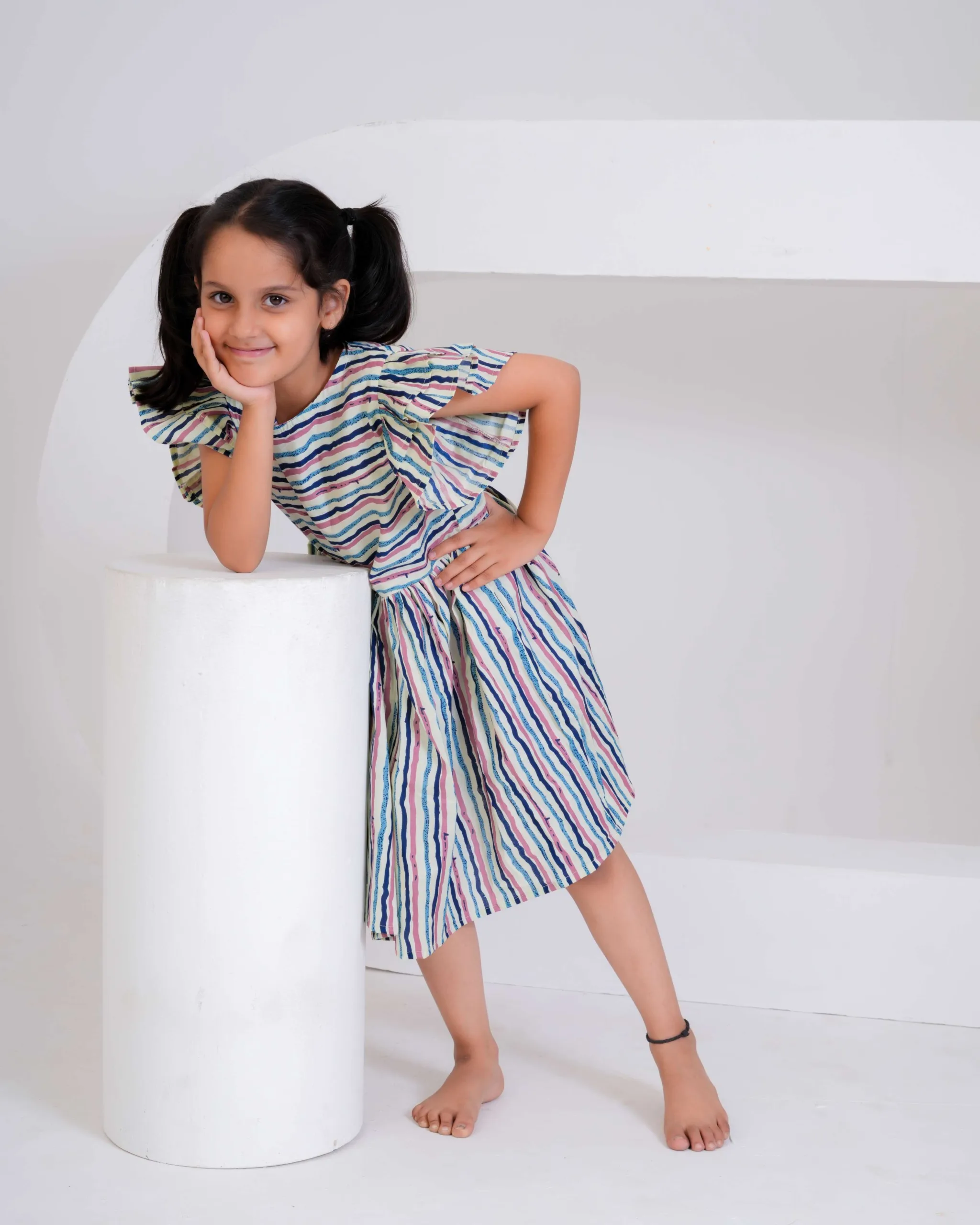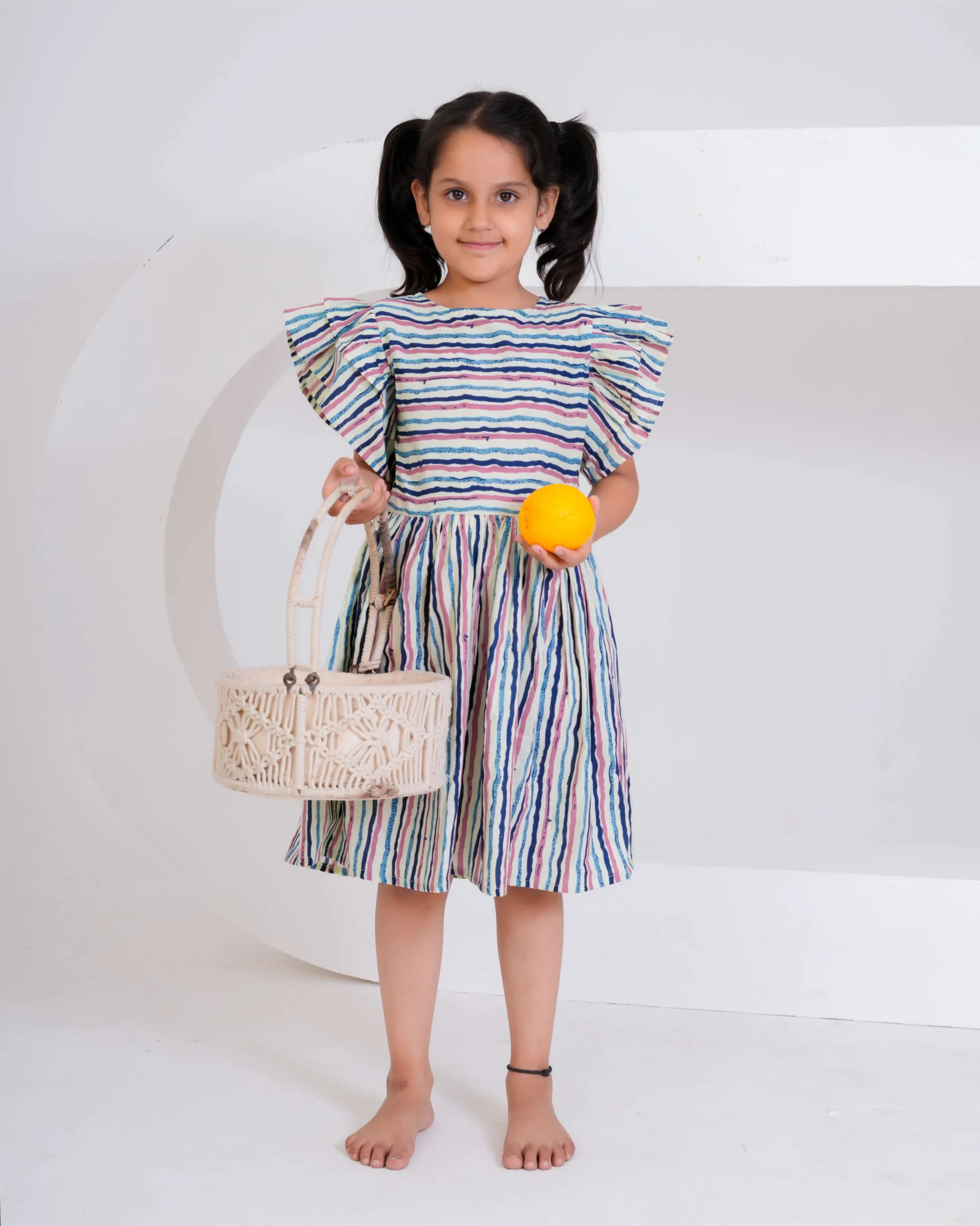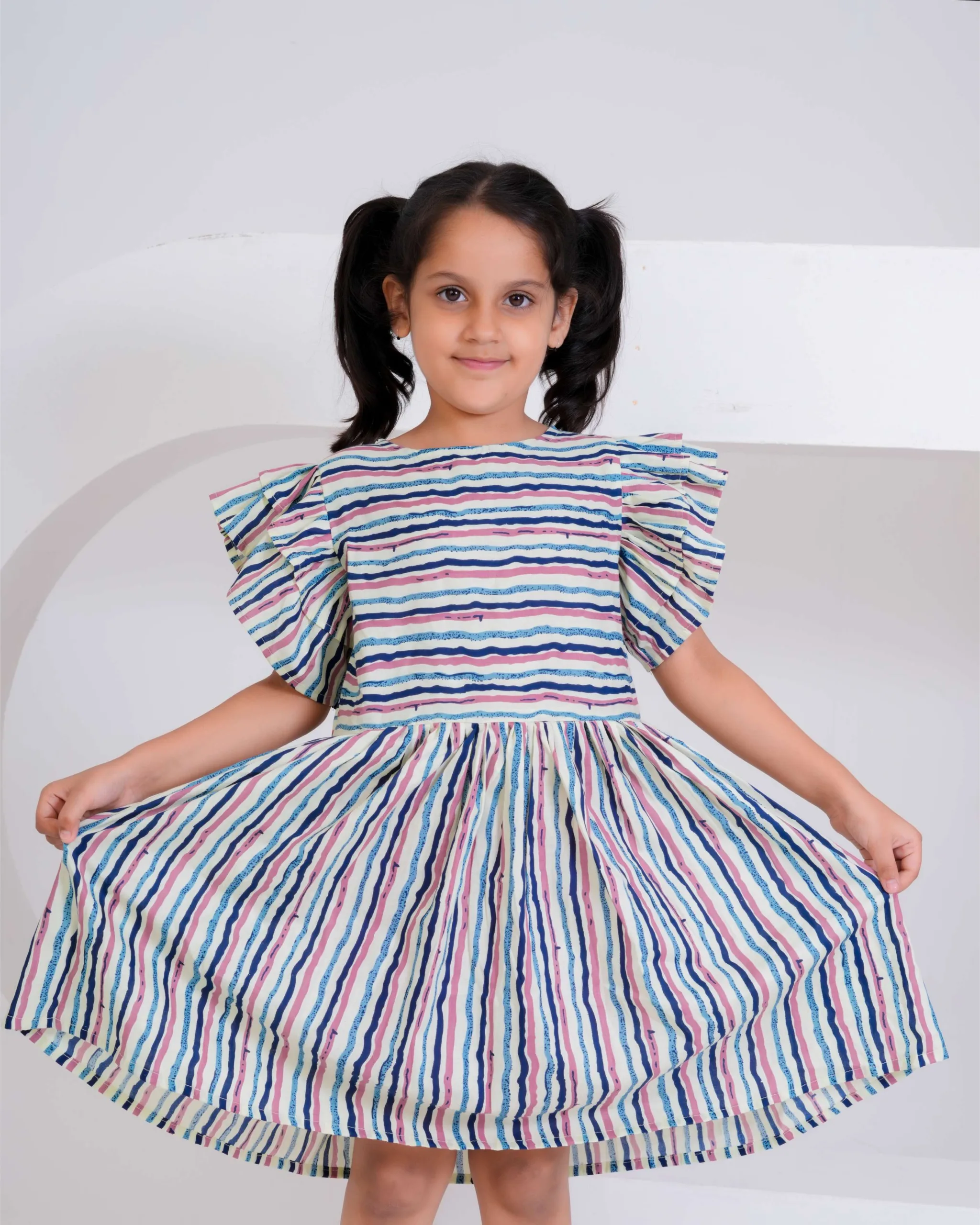Brighten up your little one’s day with this multi-colored striped cotton dress — a perfect blend of comfort and cheerful style! The dress features playful flutter sleeves and a gathered flared skirt, making it ideal for twirling and all-day fun. Crafted from soft, breathable cotton, it ensures comfort in every season. The vibrant hand-painted–style stripes add a modern yet playful charm, making it perfect for casual outings, picnics, or everyday adventures.